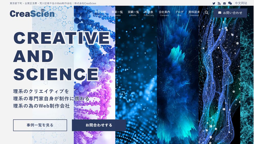 株式会社クリエイサイエンは、理系分野のサイトと中国語サイトの制作で豊富な実績を持つ製作会社です。化学・生物・医薬・材料科学の専門家や中国語のネイティブスタッフなど様々な人材が在籍しているため、専門性・信頼性の高いサイトの制作に強みがあります。