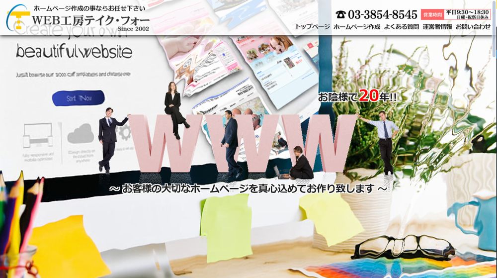 テイク・フォーは個人・中小企業向けのサイト制作やドメイン・サーバー取得代行、マーケティング支援を専門とする製作会社です。1ページ当り13,200円からサイトを制作できるという価格の安さが魅力です。レイアウトやデザインは全てオーダーメードで制作し、コストを抑えつつも集客につながるサイトを制作します。