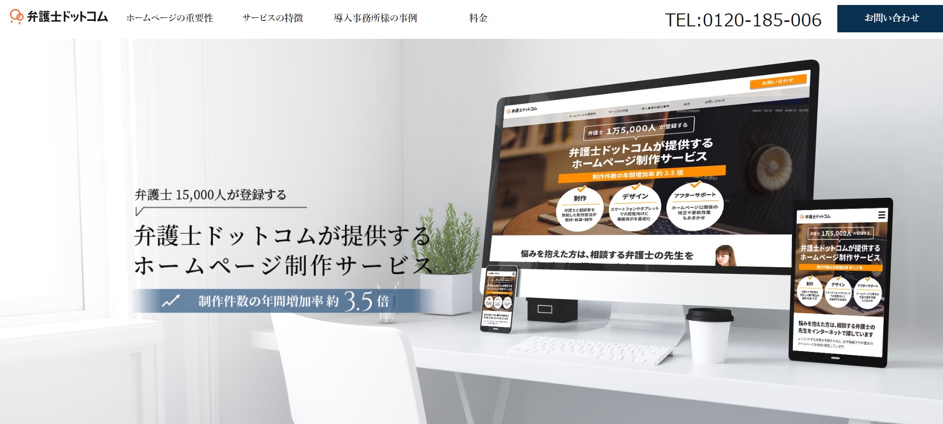 弁護士のことを熟知した制作担当が制作をワンストップで担当します。デザインはレスポンシブ対応で、HP公開後の修正や更新作業などのアフターサポートも充実しています。