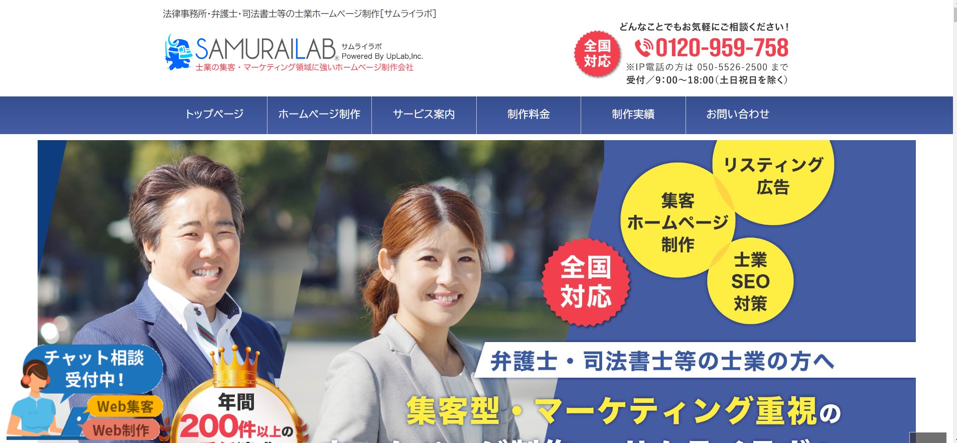 士業に特化したHP制作サービス、「サムライラボ」を提供しています。弁護士個人のホームページや法律事務所の事務所単位の集客用のホームページ制作を得意としており、集客を目的とするHP制作に力を入れています。