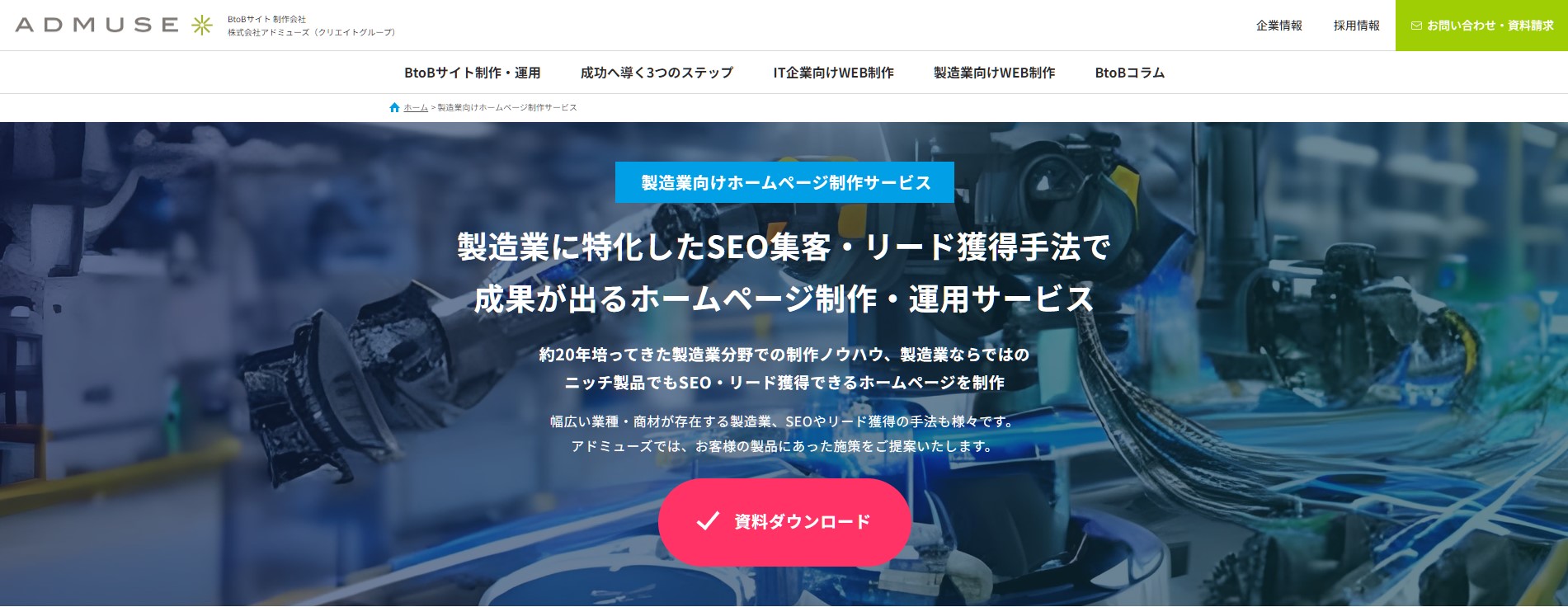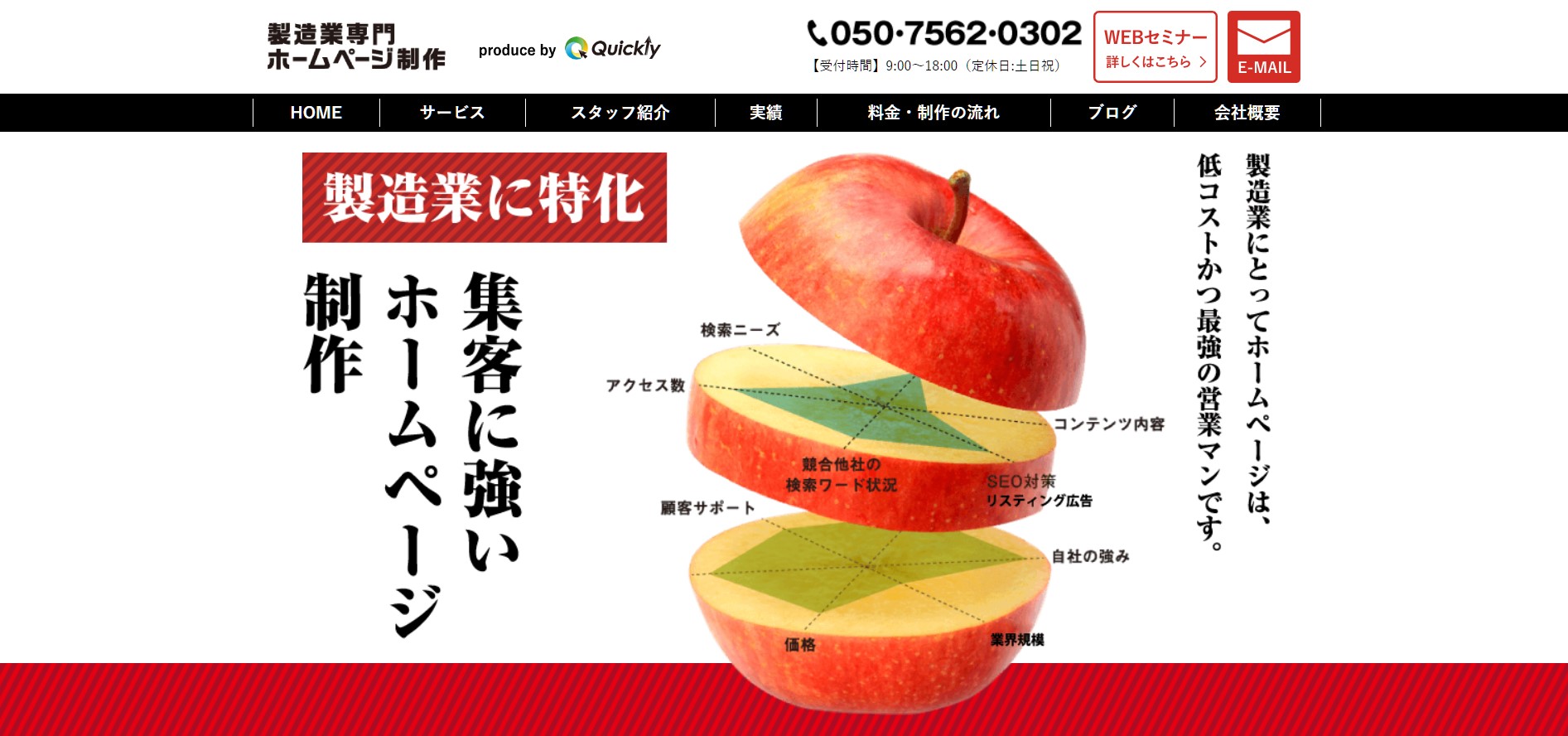 製造業に特化したHP制作サービスを展開しています。製造業向けのSEO集客、リード獲得手法を盛り込み、成果の出るサイトを制作します。競合の多い製品からニッチ製品まで、どんな商品でも対応可能です。