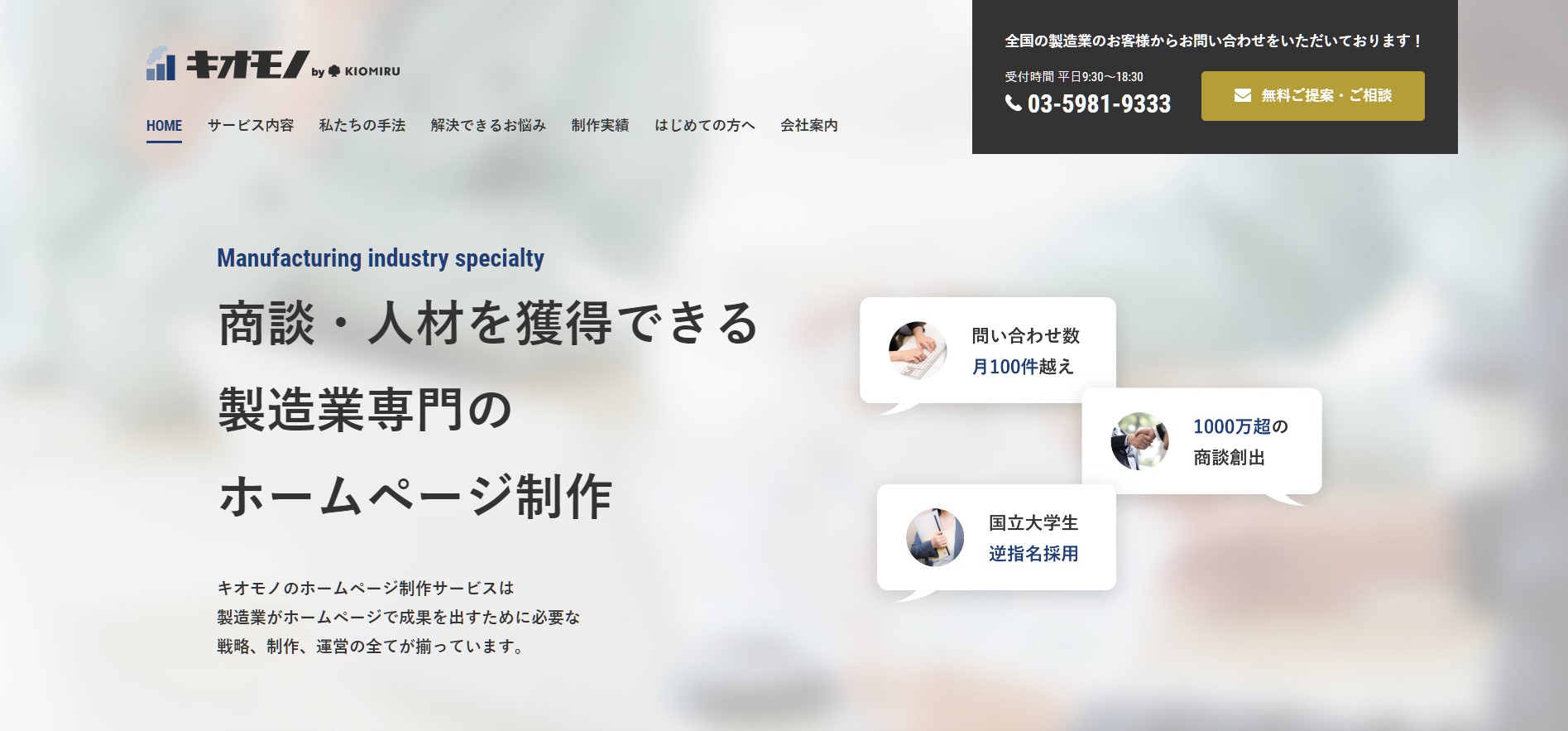 製造業に特化したサイト制作サービス「キオモノ」を展開しています。製造業がホームページで成果を出すために必要な戦略、制作、運営の全てが揃っており、商談・人材を獲得することのできるHPを制作します。