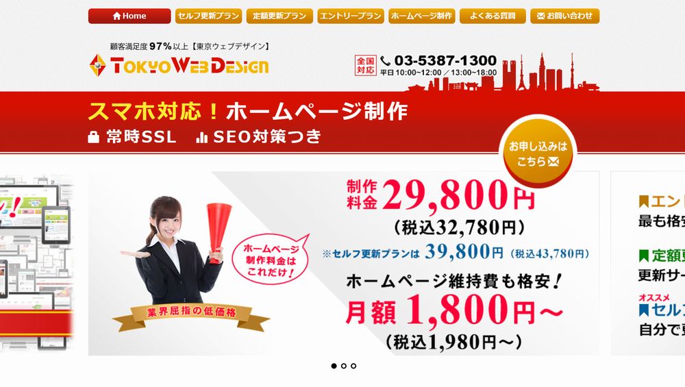 東京ウェブデザイン有限会社は、格安でのサイト制作を得意としている制作会社です。最安で29.800円からのサイト制作が可能でありながらSSL対応やスマホ対応、SEO対策などの基本的な機能は標準で搭載されています。また、月額制の更新・保守代行プランも提供しているため、サイト制作が初めての方にもおすすめです。