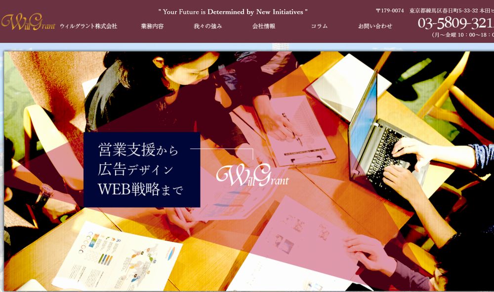 ウィルグラント株式会社は、WEBマーケティング・営業支援を専門に15年以上手がけてきた経験を持つ制作会社です。サイト制作はもちろん、コンサルティングや営業代行、印刷物制作、OA機器導入など様々な手段を通じてお客様の課題解決を支援しています。ブランディングや新規問い合わせ・資料請求等インバウンドの獲得、人材採用など幅広いお悩みに対応可能です。