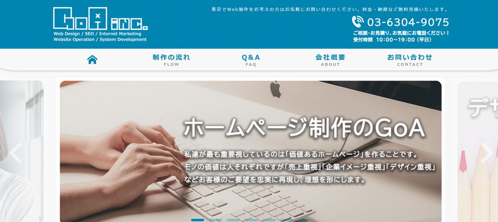 株式会社GoAは、低コストかつスピーディーなサイト制作が強みの制作会社です。最低5.5万円、最短3週間での制作が可能なほか、オーダーメードのデザイン・機能を実装したサイトの制作など幅広い要望に対応しています。広告制作やSEO対策などもオプションとして対応可能です。