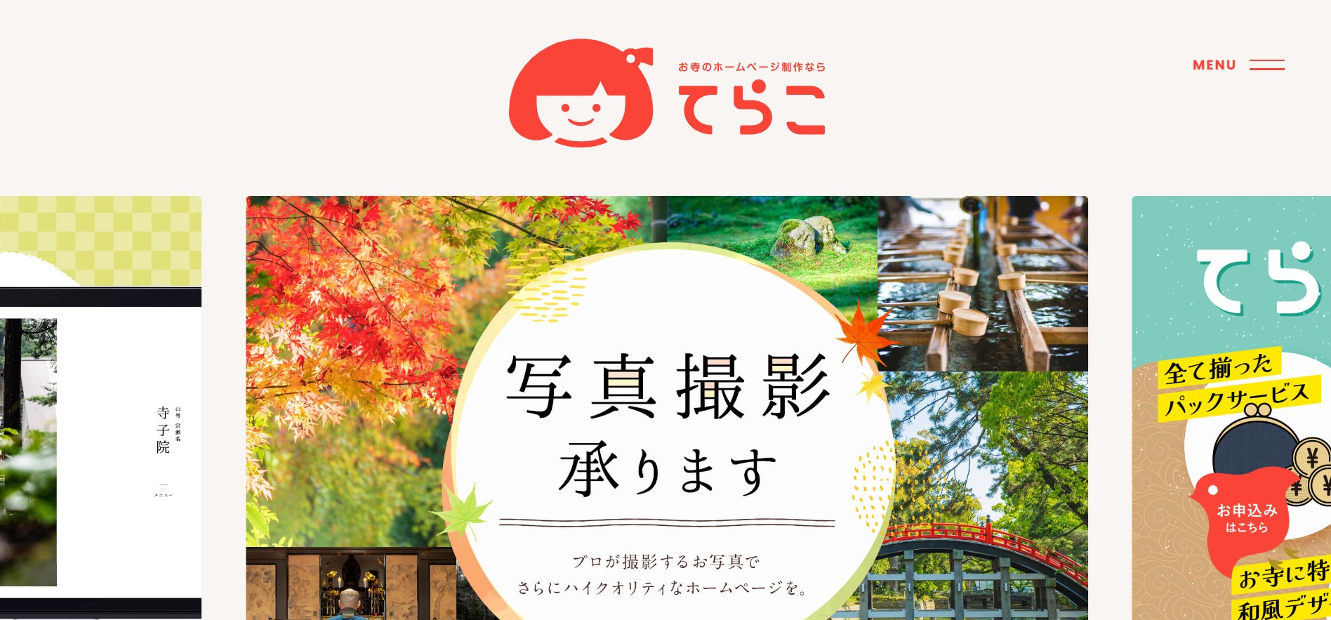ホームページ制作サービス「てらこ」では、寺院に特化したサイト制作を行っています。寺院に特化したノウハウに加え、時流に沿ったデザインのテンプレートがあります。料金はお寺のWEB制作には欠かせない必要機能が備わったパック形式で、一律料金制であることも安心できるポイントです。