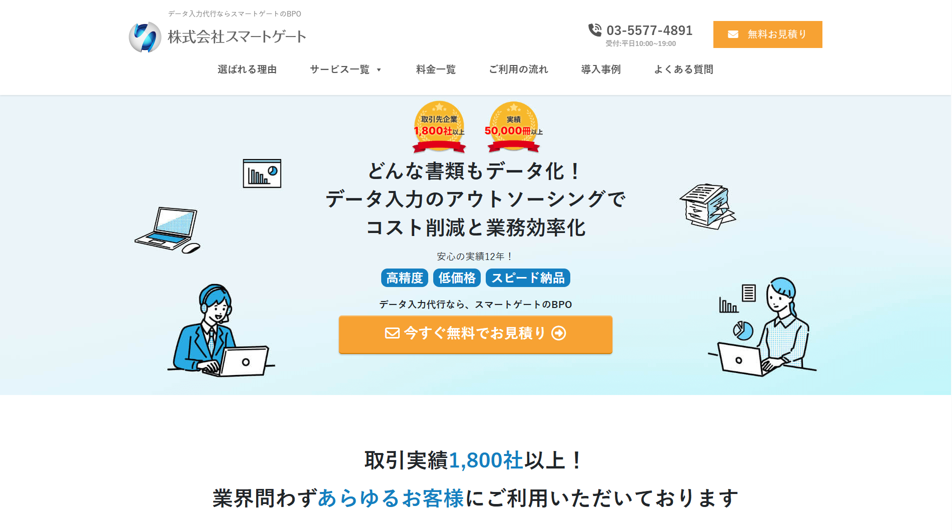 株式会社スマートゲートは、紙や本など文字情報が多い媒体のデータ化に強みを持つ入力代行会社です。創業以来、出版物の電子書籍化に携わってきたノウハウを活かし、高精度かつ安定した品質のデータを納品しています。手書き文字をはじめ、旧字、和欧文混在、回転文字、ルビ付き文字、白抜き文字、絵柄の上の文字、外国語などあらゆる文字のテキストデータ化に対応可能です。テキストに特化した独自開発のシステムや、ベテランのスタッフを活用することで、低コスト化を実現しています。