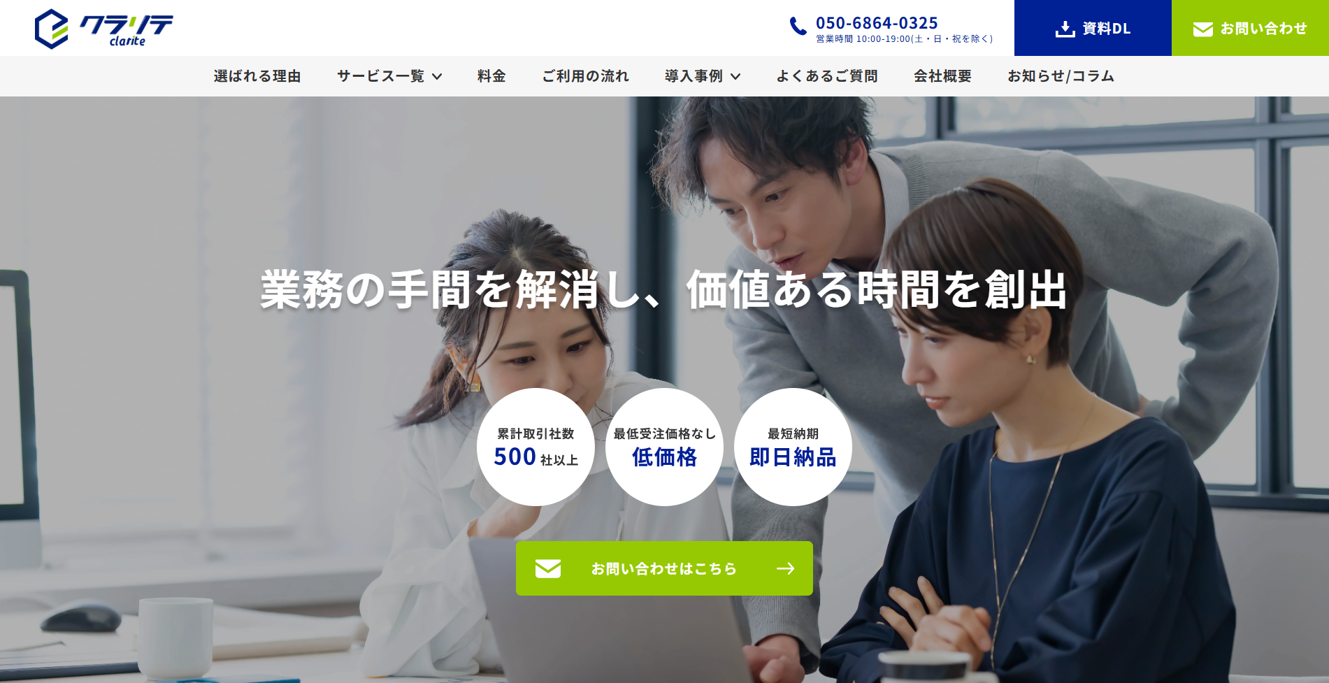 クラリテ株式会社は、最低発注金額を設けず、小規模な依頼から大規模プロジェクトまで柔軟に対応している入力代行会社です。また、最短即日での納品も可能な体制を整えており、スケジュールに合わせて対応しています。高精度なスキャニングや自動化技術などを用いることで、高精度でも低コストでの入力代行を実現しています。