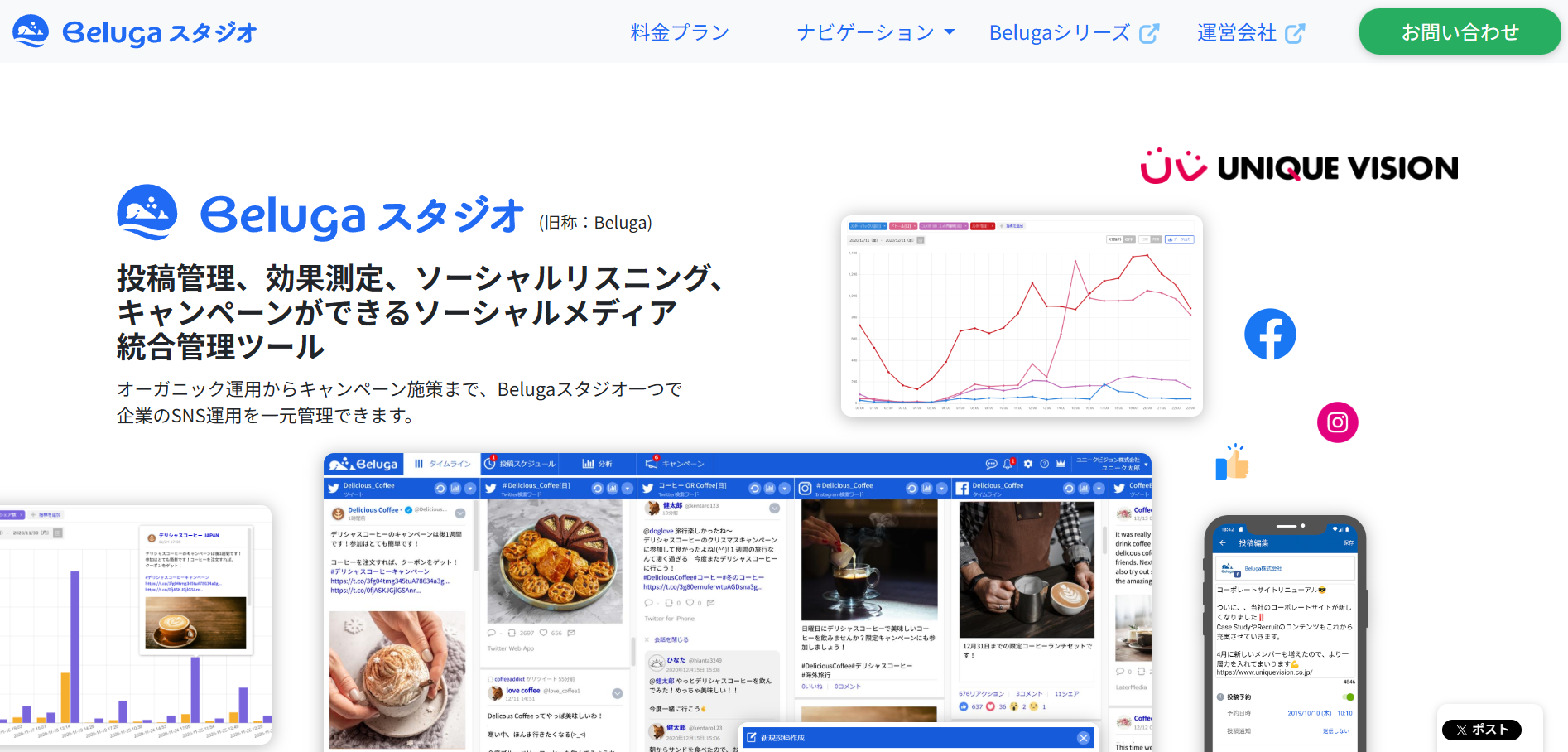 Beluga スタジオは、Twitterの投稿管理からキャンペーン実施、データ分析までを一括で行える、法人向けのSNS運用支援ツールです。複数アカウントの一元管理、投稿の予約・承認フロー、コメント対応の自動化など、業務を効率化する機能が豊富に揃っています。