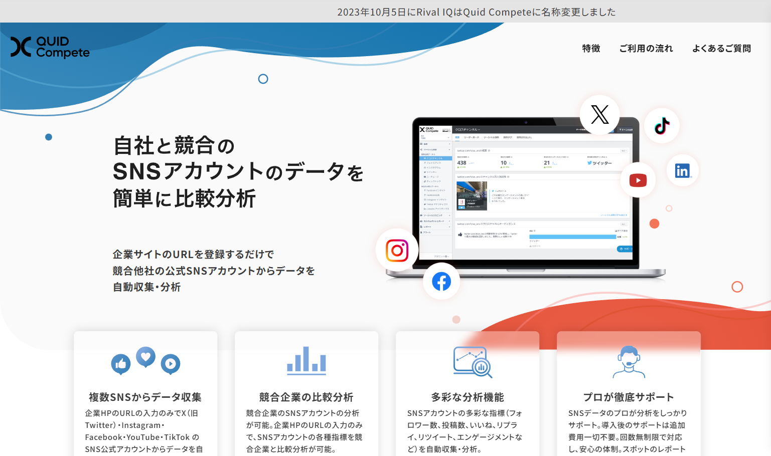 | 特徴・強み | ・競合調査に特化した分析機能 ・視覚的にわかりやすいUI設計 ・SNS以外のマーケチャネルとの横断分析も可能 |