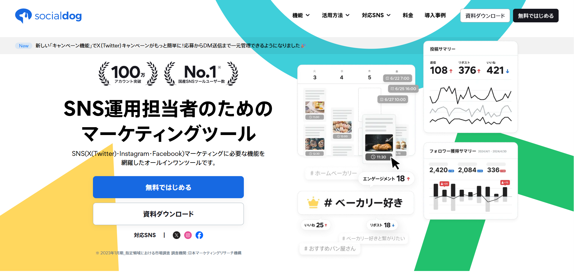 Socialdogは、Twitterのフォロー管理や予約投稿、分析機能を備えたオールインワン運用ツールです。フォロワーの増減や投稿の反応分析、自動DM送信やキーワードモニタリングなど、効率的なアカウント運用を支援する機能が含まれています。