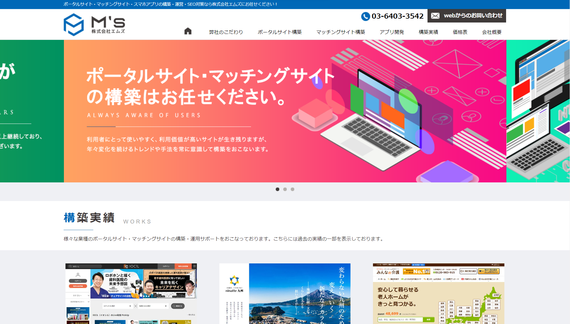 株式会社エムズは、東京都港区のシステム開発会社です。最新のWeb技術やSEO手法を活用し、数々のマッチングサイト、ポータルサイトを成功に導いてきました。