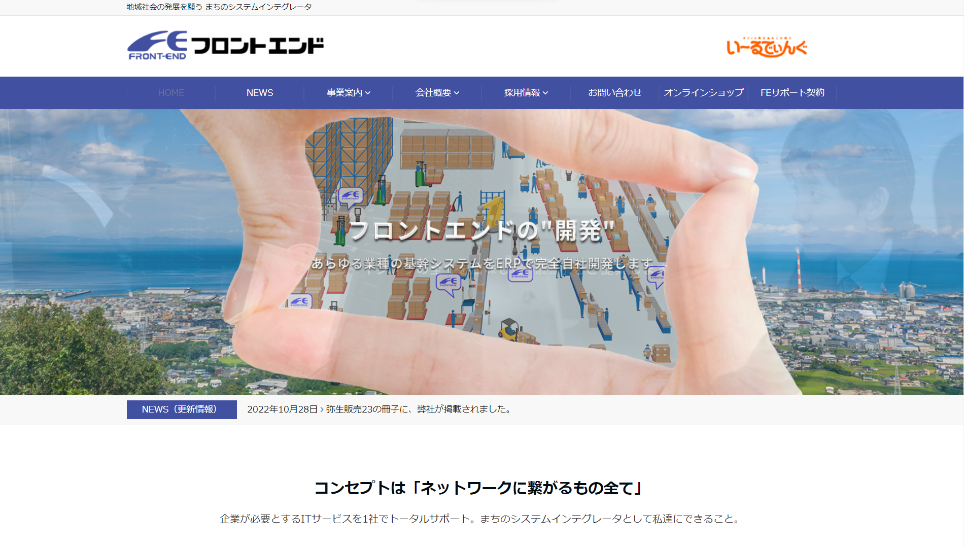 株式会社フロントエンドは、愛媛県四国中央市のシステム開発会社です。「ネットワークに繋がるもの全て」をコンセプトに、企業のITサービスをワンストップで支援しています。