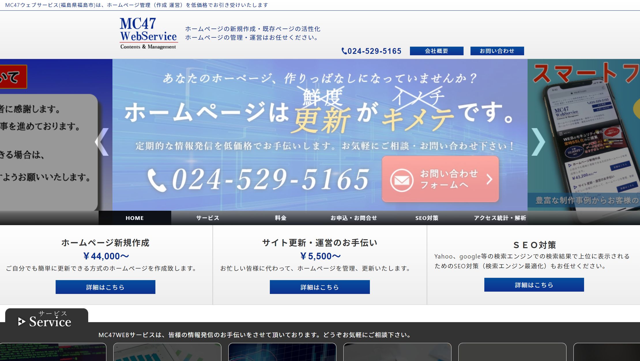 株式会社MC47WEBサービスは、福島県福島市に拠点を構えるホームページ制作会社です。SEO対策やホームページ制作、サイト更新・運営の支援等を行っています。